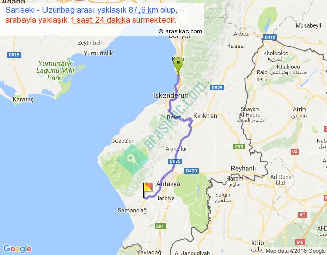 Sarıseki - Uzunbağ arası yaklaşık olarak 90 km/h ile yukarıda belirtilen sürede olup, iki yerin kuş uçuşu uzaklığı (mesafesi) 61'dir. Yolculuk otobüsle 1 saat 49 dakika sürmektedir.