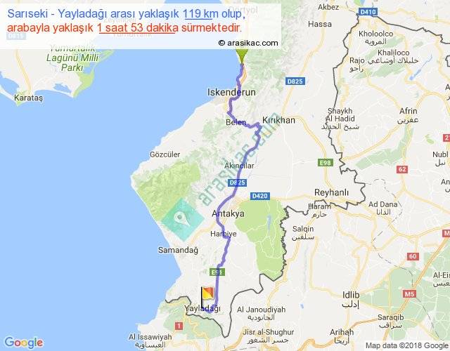 Sarıseki - Yayladağı arası yaklaşık olarak 90 km/h ile yukarıda belirtilen sürede olup, iki yerin kuş uçuşu uzaklığı (mesafesi) 86'dir. Yolculuk otobüsle 2 saat 26 dakika sürmektedir.