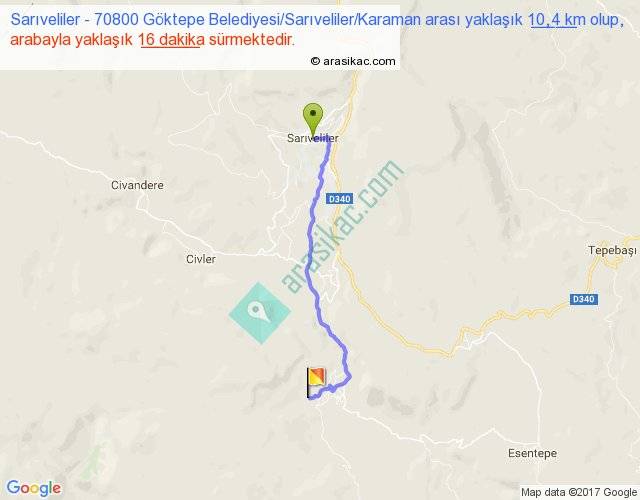Sarıveliler - 70800 Göktepe Belediyesi Sarıveliler Karaman arası yaklaşık olarak 90 km/h ile yukarıda belirtilen sürede olup, iki yerin kuş uçuşu uzaklığı (mesafesi) 8'dir. Yolculuk otobüsle 24 dakika sürmektedir.