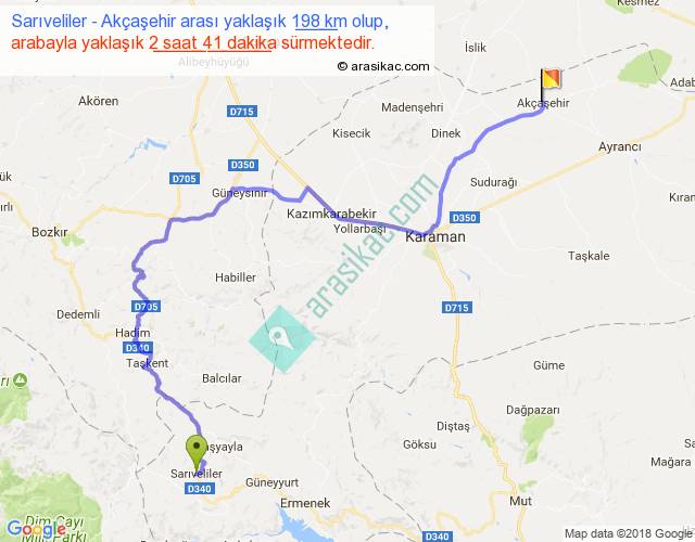 Sarıveliler - Akçaşehir arası yaklaşık olarak 90 km/h ile yukarıda belirtilen sürede olup, iki yerin kuş uçuşu uzaklığı (mesafesi) 113'dir. Yolculuk otobüsle 3 saat 29 dakika sürmektedir.