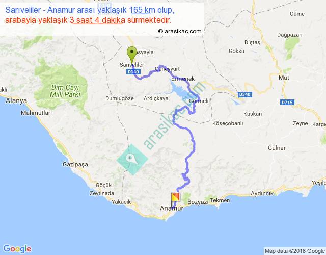 Sarıveliler - Anamur arası yaklaşık olarak 90 km/h ile yukarıda belirtilen sürede olup, iki yerin kuş uçuşu uzaklığı (mesafesi) 71'dir. Yolculuk otobüsle 3 saat 59 dakika sürmektedir.