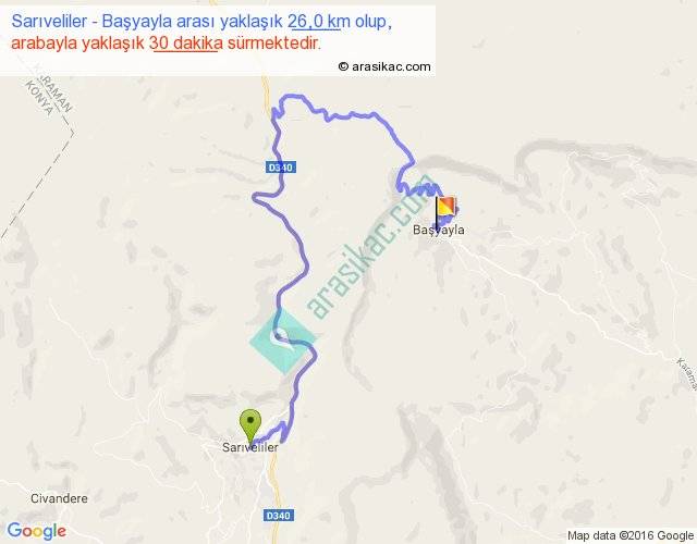 Sarıveliler - Başyayla arası yaklaşık olarak 90 km/h ile yukarıda belirtilen sürede olup, iki yerin kuş uçuşu uzaklığı (mesafesi) 8'dir. Yolculuk otobüsle 39 dakika sürmektedir.