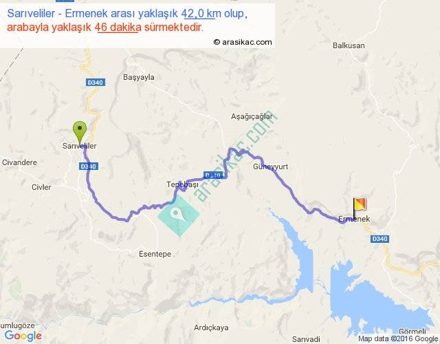 Sarıveliler - Ermenek arası yaklaşık olarak 90 km/h ile yukarıda belirtilen sürede olup, iki yerin kuş uçuşu uzaklığı (mesafesi) 25'dir. Yolculuk otobüsle 59 dakika sürmektedir.