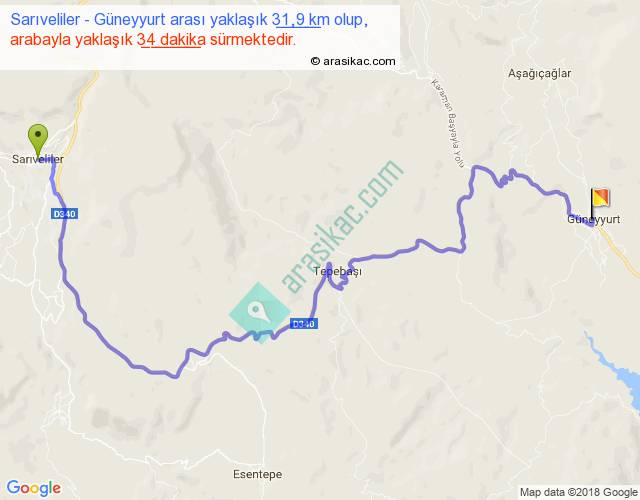 Sarıveliler - Güneyyurt arası yaklaşık olarak 90 km/h ile yukarıda belirtilen sürede olup, iki yerin kuş uçuşu uzaklığı (mesafesi) 17'dir. Yolculuk otobüsle 44 dakika sürmektedir.