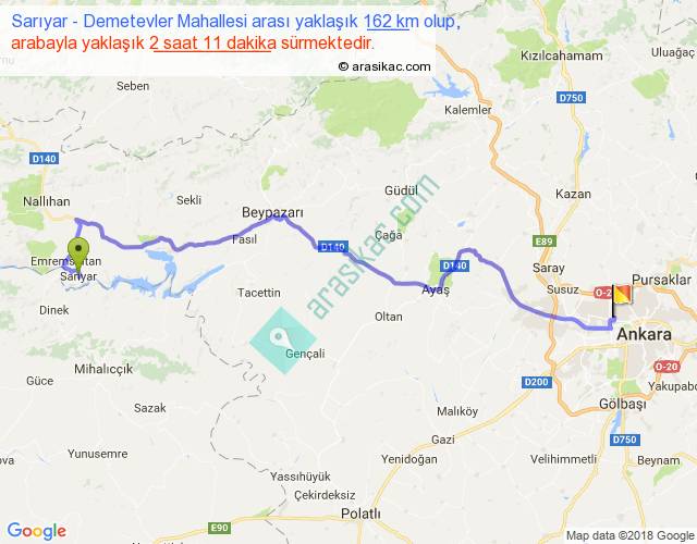 Sarıyar - Demetevler Mahallesi arası yaklaşık olarak 90 km/h ile yukarıda belirtilen sürede olup, iki yerin kuş uçuşu uzaklığı (mesafesi) 115'dir. Yolculuk otobüsle 2 saat 50 dakika sürmektedir.