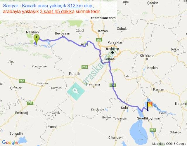 Sarıyar - Kacarlı arası yaklaşık olarak 90 km/h ile yukarıda belirtilen sürede olup, iki yerin kuş uçuşu uzaklığı (mesafesi) 207'dir. Yolculuk otobüsle 4 saat 52 dakika sürmektedir.