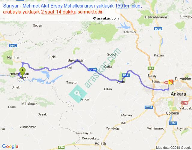Sarıyar - Mehmet Akif Ersoy Mahallesi arası yaklaşık olarak 90 km/h ile yukarıda belirtilen sürede olup, iki yerin kuş uçuşu uzaklığı (mesafesi) 113'dir. Yolculuk otobüsle 2 saat 54 dakika sürmektedir.