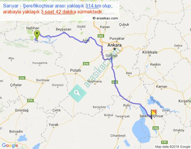 Sarıyar - Şereflikoçhisar arası yaklaşık olarak 90 km/h ile yukarıda belirtilen sürede olup, iki yerin kuş uçuşu uzaklığı (mesafesi) 217'dir. Yolculuk otobüsle 4 saat 48 dakika sürmektedir.