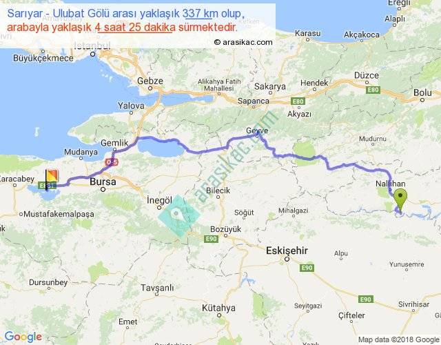 Sarıyar - Ulubat Gölü arası yaklaşık olarak 90 km/h ile yukarıda belirtilen sürede olup, iki yerin kuş uçuşu uzaklığı (mesafesi) 239'dir. Yolculuk otobüsle 5 saat 44 dakika sürmektedir.