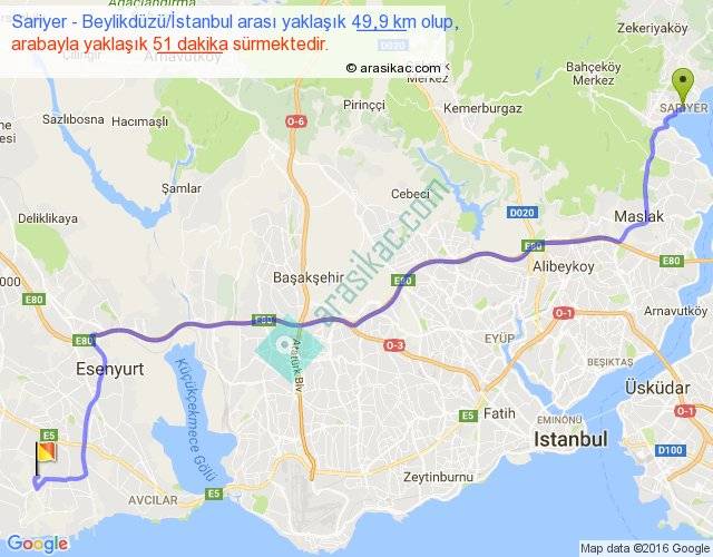 Sariyer - Beylikdüzü İstanbul arası yaklaşık olarak 90 km/h ile yukarıda belirtilen sürede olup, iki yerin kuş uçuşu uzaklığı (mesafesi) 38'dir. Yolculuk otobüsle 1 saat 6 dakika sürmektedir.