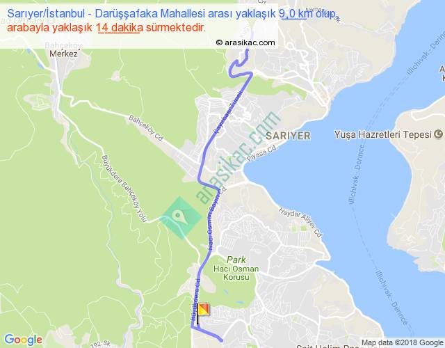 Sarıyer İstanbul - Darüşşafaka Mahallesi arası yaklaşık olarak 90 km/h ile yukarıda belirtilen sürede olup, iki yerin kuş uçuşu uzaklığı (mesafesi) 6'dir. Yolculuk otobüsle 18 dakika sürmektedir.
