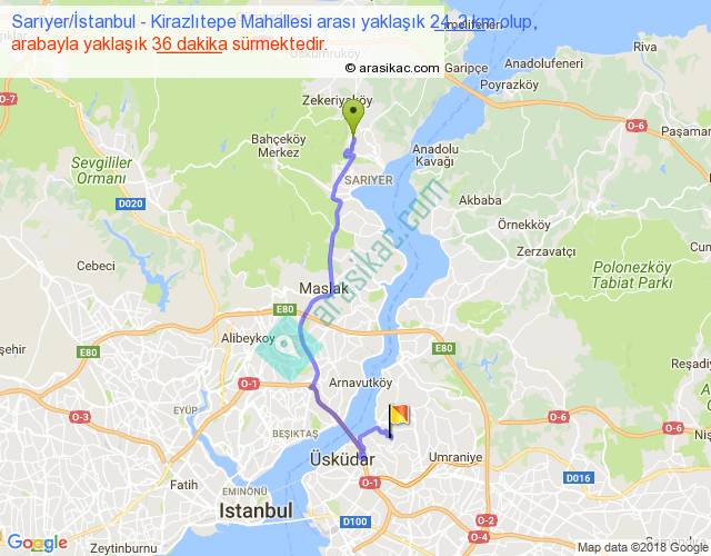 Sarıyer İstanbul - Kirazlıtepe Mahallesi arası yaklaşık olarak 90 km/h ile yukarıda belirtilen sürede olup, iki yerin kuş uçuşu uzaklığı (mesafesi) 16'dir. Yolculuk otobüsle 46 dakika sürmektedir.