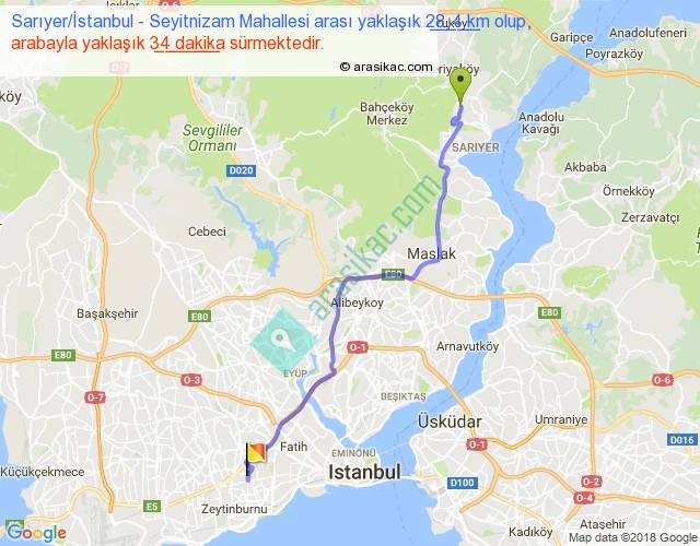 Sarıyer İstanbul - Seyitnizam Mahallesi arası yaklaşık olarak 90 km/h ile yukarıda belirtilen sürede olup, iki yerin kuş uçuşu uzaklığı (mesafesi) 22'dir. Yolculuk otobüsle 44 dakika sürmektedir.