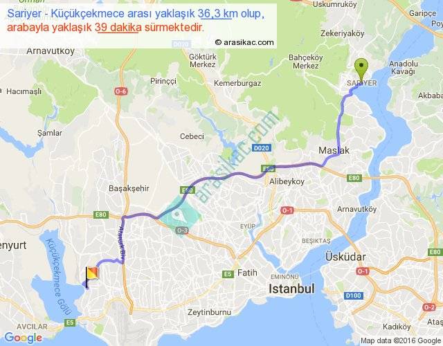 Sariyer - Küçükçekmece arası yaklaşık olarak 90 km/h ile yukarıda belirtilen sürede olup, iki yerin kuş uçuşu uzaklığı (mesafesi) 28'dir. Yolculuk otobüsle 53 dakika sürmektedir.