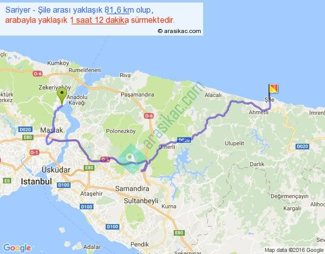 Sariyer - Şile arası yaklaşık olarak 90 km/h ile yukarıda belirtilen sürede olup, iki yerin kuş uçuşu uzaklığı (mesafesi) 47'dir. Yolculuk otobüsle 1 saat 33 dakika sürmektedir.