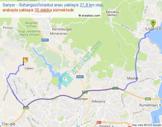 Sariyer - Sultangazi İstanbul arası yaklaşık olarak 90 km/h ile yukarıda belirtilen sürede olup, iki yerin kuş uçuşu uzaklığı (mesafesi) 15'dir. Yolculuk otobüsle 45 dakika sürmektedir.