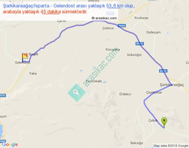 Şarkikaraağaç Isparta - Gelendost arası yaklaşık olarak 90 km/h ile yukarıda belirtilen sürede olup, iki yerin kuş uçuşu uzaklığı (mesafesi) 32'dir. Yolculuk otobüsle 58 dakika sürmektedir.