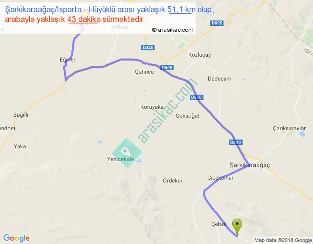 Şarkikaraağaç Isparta - Hüyüklü arası yaklaşık olarak 90 km/h ile yukarıda belirtilen sürede olup, iki yerin kuş uçuşu uzaklığı (mesafesi) 32'dir. Yolculuk otobüsle 55 dakika sürmektedir.