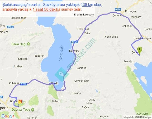 Şarkikaraağaç Isparta - Savköy arası yaklaşık olarak 90 km/h ile yukarıda belirtilen sürede olup, iki yerin kuş uçuşu uzaklığı (mesafesi) 67'dir. Yolculuk otobüsle 2 saat 30 dakika sürmektedir.