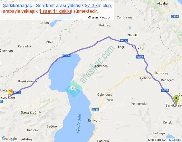 Şarkikaraağaç - Senirkent arası yaklaşık olarak 90 km/h ile yukarıda belirtilen sürede olup, iki yerin kuş uçuşu uzaklığı (mesafesi) 71'dir. Yolculuk otobüsle 1 saat 32 dakika sürmektedir.
