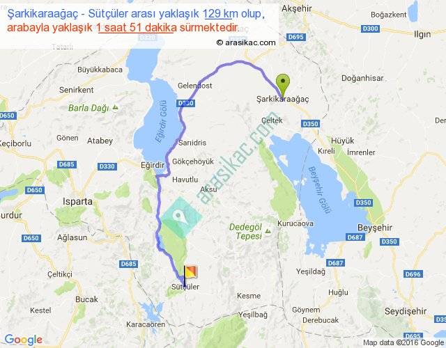 Şarkikaraağaç - Sütçüler arası yaklaşık olarak 90 km/h ile yukarıda belirtilen sürede olup, iki yerin kuş uçuşu uzaklığı (mesafesi) 73'dir. Yolculuk otobüsle 2 saat 24 dakika sürmektedir.