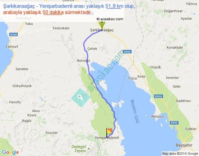 Şarkikaraağaç - Yenişarbademli arası yaklaşık olarak 90 km/h ile yukarıda belirtilen sürede olup, iki yerin kuş uçuşu uzaklığı (mesafesi) 41'dir. Yolculuk otobüsle 1 saat 5 dakika sürmektedir.