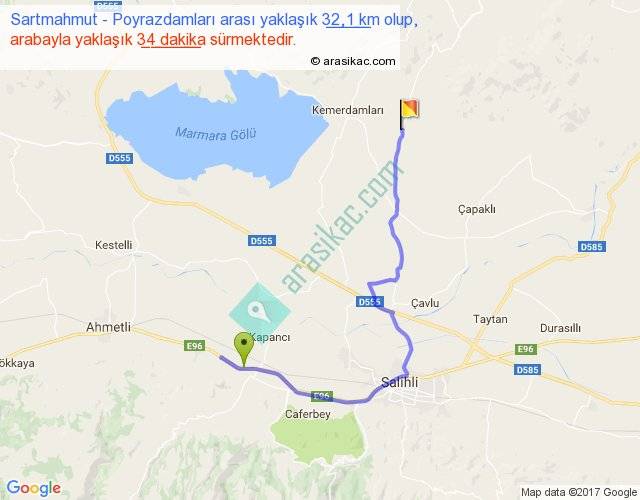 Sartmahmut - Poyrazdamları arası yaklaşık olarak 90 km/h ile yukarıda belirtilen sürede olup, iki yerin kuş uçuşu uzaklığı (mesafesi) 17'dir. Yolculuk otobüsle 44 dakika sürmektedir.