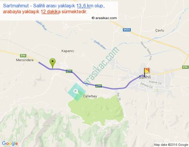 Sartmahmut - Salihli arası yaklaşık olarak 90 km/h ile yukarıda belirtilen sürede olup, iki yerin kuş uçuşu uzaklığı (mesafesi) 9'dir. Yolculuk otobüsle 15 dakika sürmektedir.