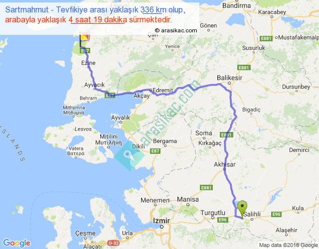 Sartmahmut - Tevfikiye arası yaklaşık olarak 90 km/h ile yukarıda belirtilen sürede olup, iki yerin kuş uçuşu uzaklığı (mesafesi) 222'dir. Yolculuk otobüsle 5 saat 36 dakika sürmektedir.