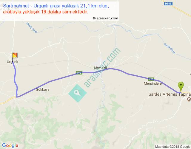 Sartmahmut - Urganlı arası yaklaşık olarak 90 km/h ile yukarıda belirtilen sürede olup, iki yerin kuş uçuşu uzaklığı (mesafesi) 17'dir. Yolculuk otobüsle 24 dakika sürmektedir.