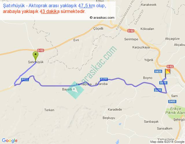 Şatırhüyük - Aktoprak arası yaklaşık olarak 90 km/h ile yukarıda belirtilen sürede olup, iki yerin kuş uçuşu uzaklığı (mesafesi) 27'dir. Yolculuk otobüsle 55 dakika sürmektedir.