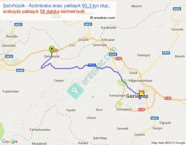 Şatırhüyük - Aydınbaba arası yaklaşık olarak 90 km/h ile yukarıda belirtilen sürede olup, iki yerin kuş uçuşu uzaklığı (mesafesi) 41'dir. Yolculuk otobüsle 1 saat 15 dakika sürmektedir.