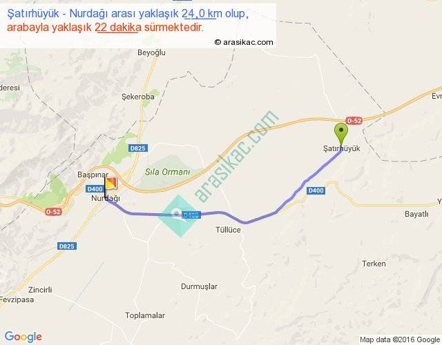 Şatırhüyük - Nurdağı arası yaklaşık olarak 90 km/h ile yukarıda belirtilen sürede olup, iki yerin kuş uçuşu uzaklığı (mesafesi) 21'dir. Yolculuk otobüsle 28 dakika sürmektedir.