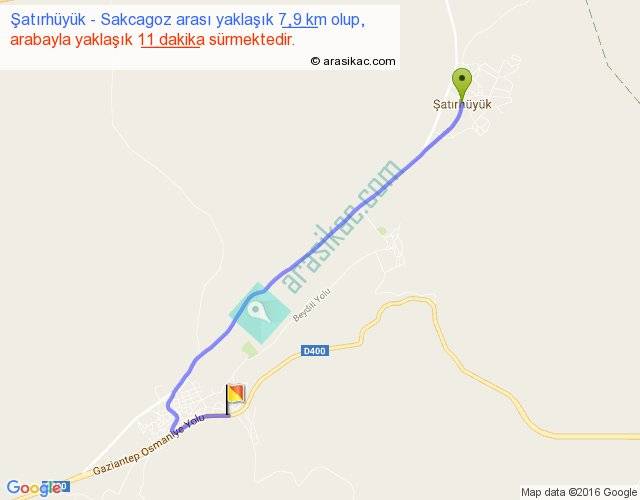Şatırhüyük - Sakcagoz arası yaklaşık olarak 90 km/h ile yukarıda belirtilen sürede olup, iki yerin kuş uçuşu uzaklığı (mesafesi) 6'dir. Yolculuk otobüsle 14 dakika sürmektedir.