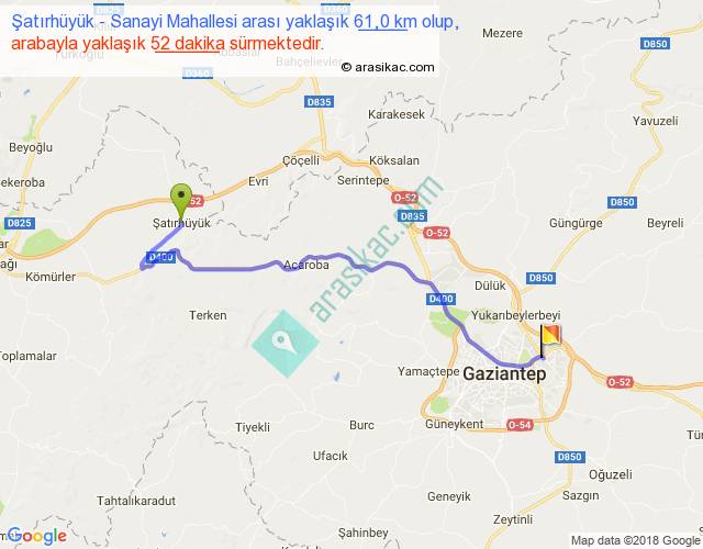 Şatırhüyük - Sanayi Mahallesi arası yaklaşık olarak 90 km/h ile yukarıda belirtilen sürede olup, iki yerin kuş uçuşu uzaklığı (mesafesi) 43'dir. Yolculuk otobüsle 1 saat 7 dakika sürmektedir.