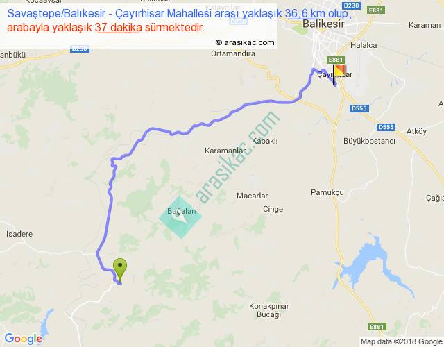 Savaştepe Balıkesir - Çayırhisar Mahallesi arası yaklaşık olarak 90 km/h ile yukarıda belirtilen sürede olup, iki yerin kuş uçuşu uzaklığı (mesafesi) 25'dir. Yolculuk otobüsle 48 dakika sürmektedir.