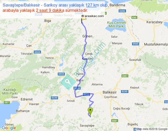 Savaştepe Balıkesir - Sarikoy arası yaklaşık olarak 90 km/h ile yukarıda belirtilen sürede olup, iki yerin kuş uçuşu uzaklığı (mesafesi) 84'dir. Yolculuk otobüsle 2 saat 47 dakika sürmektedir.