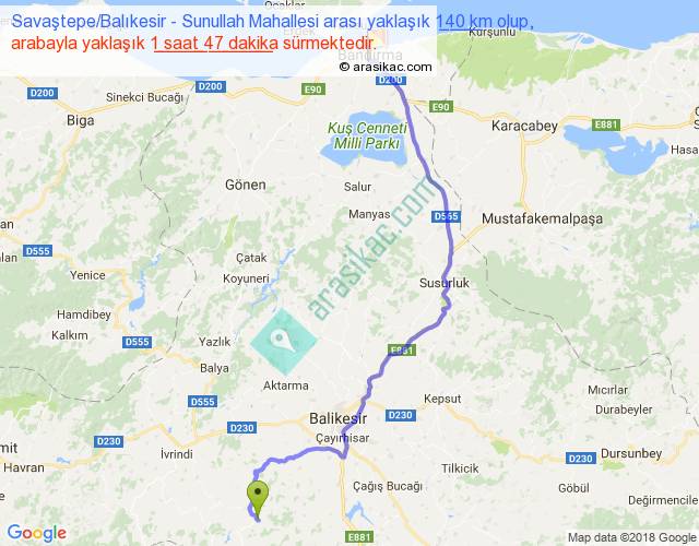 Savaştepe Balıkesir - Sunullah Mahallesi arası yaklaşık olarak 90 km/h ile yukarıda belirtilen sürede olup, iki yerin kuş uçuşu uzaklığı (mesafesi) 101'dir. Yolculuk otobüsle 2 saat 19 dakika sürmektedir.