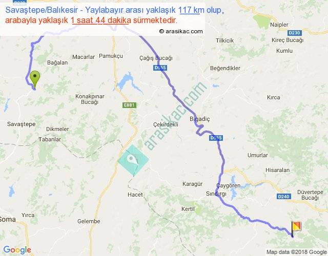 Savaştepe Balıkesir - Yaylabayır arası yaklaşık olarak 90 km/h ile yukarıda belirtilen sürede olup, iki yerin kuş uçuşu uzaklığı (mesafesi) 68'dir. Yolculuk otobüsle 2 saat 15 dakika sürmektedir.