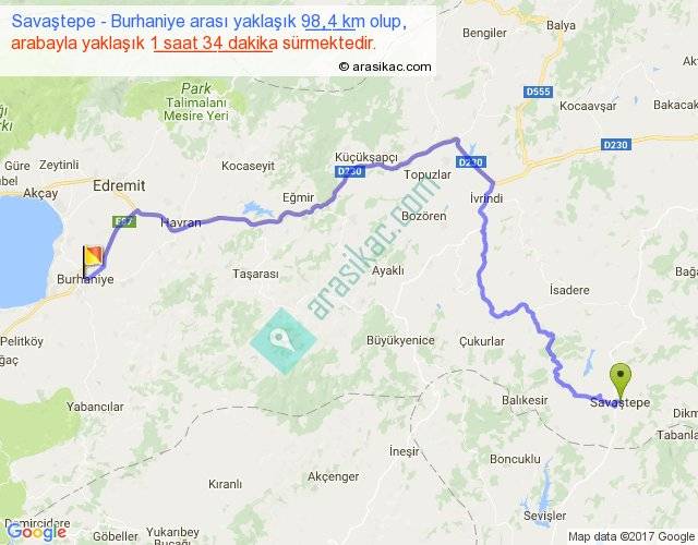 Savaştepe - Burhaniye arası yaklaşık olarak 90 km/h ile yukarıda belirtilen sürede olup, iki yerin kuş uçuşu uzaklığı (mesafesi) 59'dir. Yolculuk otobüsle 2 saat 0 dakika sürmektedir.