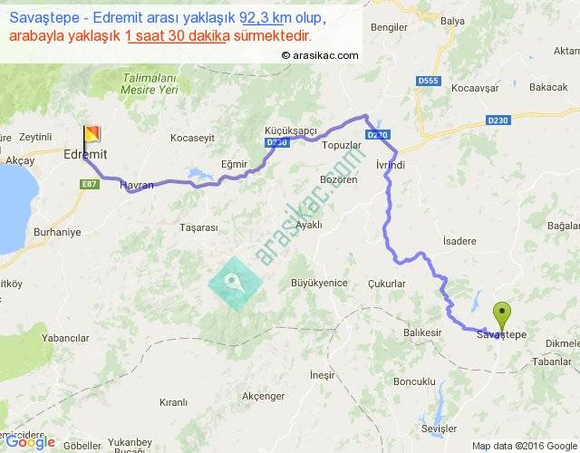 Savaştepe - Edremit arası yaklaşık olarak 90 km/h ile yukarıda belirtilen sürede olup, iki yerin kuş uçuşu uzaklığı (mesafesi) 59'dir. Yolculuk otobüsle 1 saat 57 dakika sürmektedir.