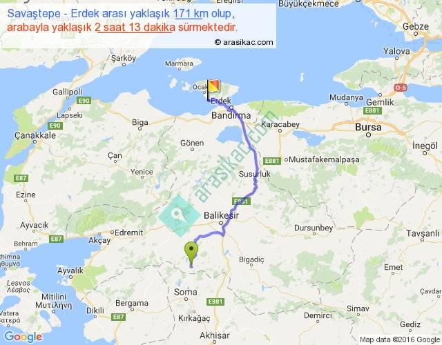 Savaştepe - Erdek arası yaklaşık olarak 90 km/h ile yukarıda belirtilen sürede olup, iki yerin kuş uçuşu uzaklığı (mesafesi) 113'dir. Yolculuk otobüsle 2 saat 52 dakika sürmektedir.