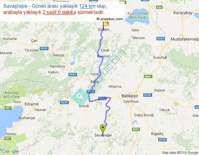 Savaştepe - Gönen arası yaklaşık olarak 90 km/h ile yukarıda belirtilen sürede olup, iki yerin kuş uçuşu uzaklığı (mesafesi) 79'dir. Yolculuk otobüsle 2 saat 36 dakika sürmektedir.