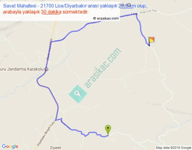 Savat Mahallesi - 21700 Lice Diyarbakır arası yaklaşık olarak 90 km/h ile yukarıda belirtilen sürede olup, iki yerin kuş uçuşu uzaklığı (mesafesi) 10'dir. Yolculuk otobüsle 39 dakika sürmektedir.