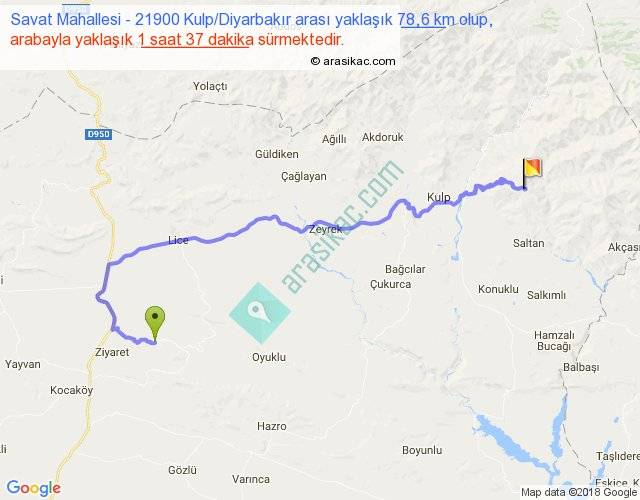 Savat Mahallesi - 21900 Kulp Diyarbakır arası yaklaşık olarak 90 km/h ile yukarıda belirtilen sürede olup, iki yerin kuş uçuşu uzaklığı (mesafesi) 48'dir. Yolculuk otobüsle 2 saat 6 dakika sürmektedir.