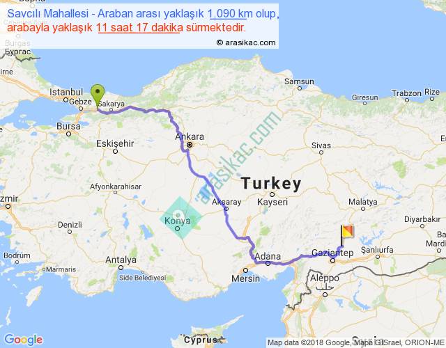 Savcılı Mahallesi - Araban arası yaklaşık olarak 90 km/h ile yukarıda belirtilen sürede olup, iki yerin kuş uçuşu uzaklığı (mesafesi) 758'dir. Eğer belirtilen yerler arasında uçak seferi var ise bu süre uçakla 1 saat 09 dakika'ya kadar düşebilir. Yolculuk otobüsle 14 saat 40 dakika sürmektedir.