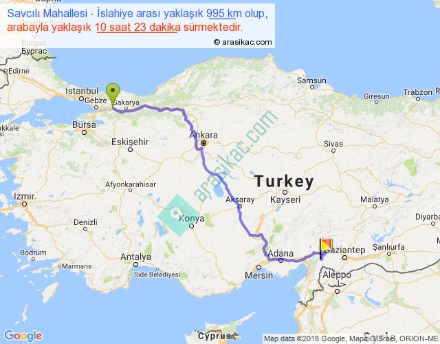 Savcılı Mahallesi - İslahiye arası yaklaşık olarak 90 km/h ile yukarıda belirtilen sürede olup, iki yerin kuş uçuşu uzaklığı (mesafesi) 706'dir. Eğer belirtilen yerler arasında uçak seferi var ise bu süre uçakla 1 saat 05 dakika'ya kadar düşebilir. Yolculuk otobüsle 13 saat 29 dakika sürmektedir.