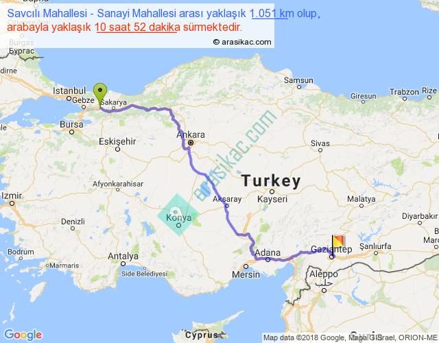 Savcılı Mahallesi - Sanayi Mahallesi arası yaklaşık olarak 90 km/h ile yukarıda belirtilen sürede olup, iki yerin kuş uçuşu uzaklığı (mesafesi) 760'dir. Eğer belirtilen yerler arasında uçak seferi var ise bu süre uçakla 1 saat 10 dakika'ya kadar düşebilir. Yolculuk otobüsle 14 saat 7 dakika sürmektedir.