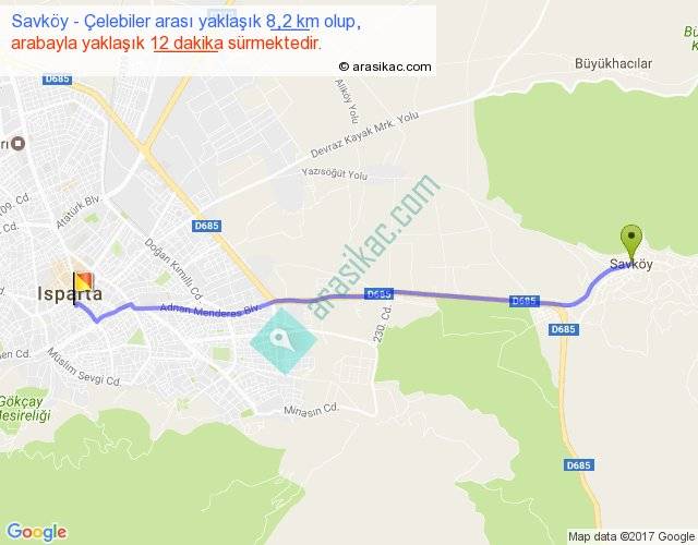 Savköy - Çelebiler arası yaklaşık olarak 90 km/h ile yukarıda belirtilen sürede olup, iki yerin kuş uçuşu uzaklığı (mesafesi) 8'dir. Yolculuk otobüsle 15 dakika sürmektedir.