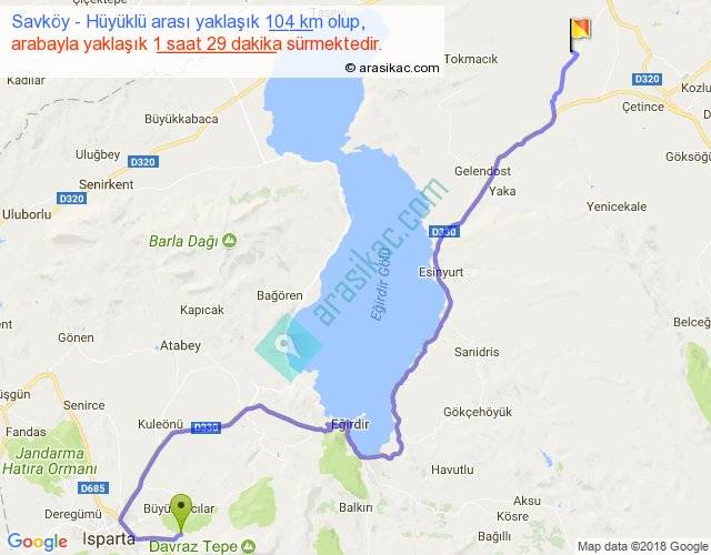 Savköy - Hüyüklü arası yaklaşık olarak 90 km/h ile yukarıda belirtilen sürede olup, iki yerin kuş uçuşu uzaklığı (mesafesi) 67'dir. Yolculuk otobüsle 1 saat 55 dakika sürmektedir.